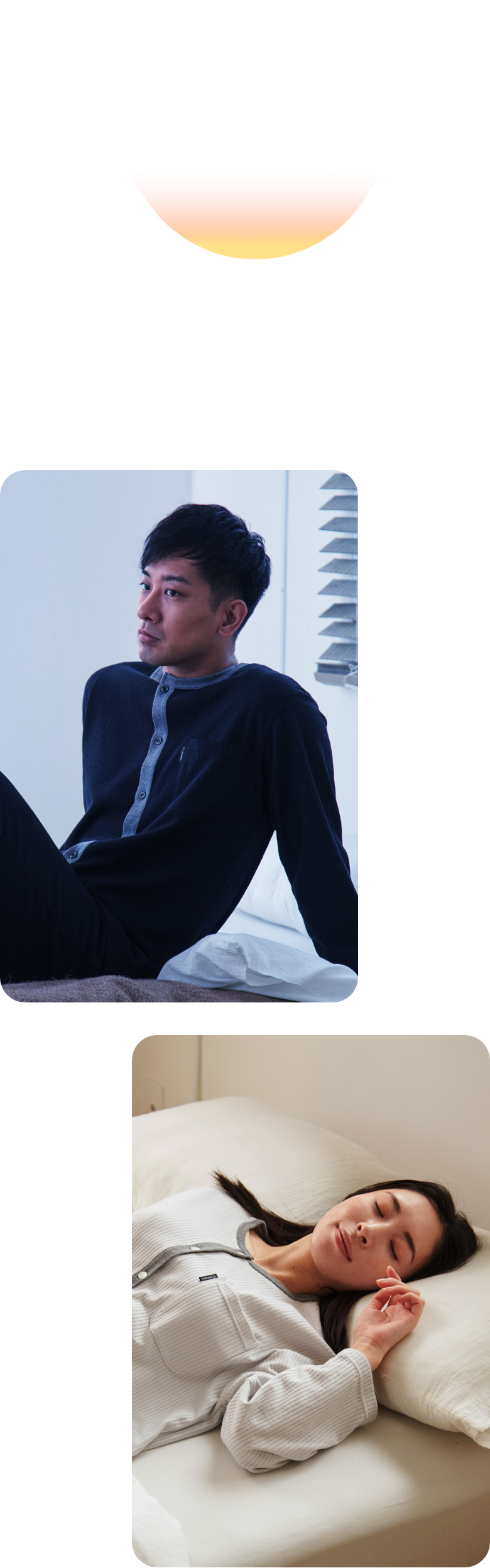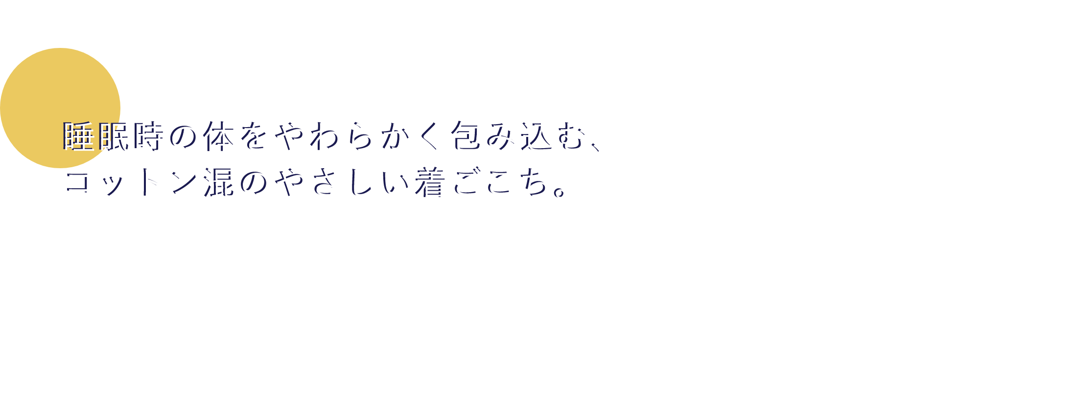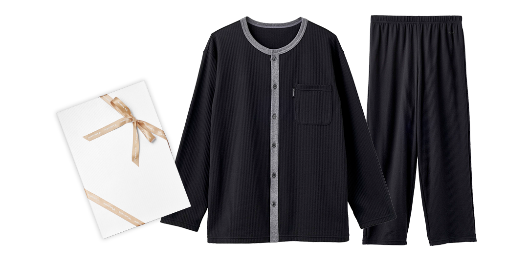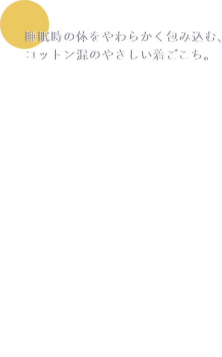 人は就寝時に”1日20回前後の寝返りを打つ”といわれていることから、身体の動きを妨げないようゆったりとしたシルエットに。首回り・前立てには伸縮性に富んだやわらかな肌触りのコットンコーマフライスを採用。配色を組むことでアクセントを作り、上下のコントラストにメリハリを付けたデザインに仕上げました。