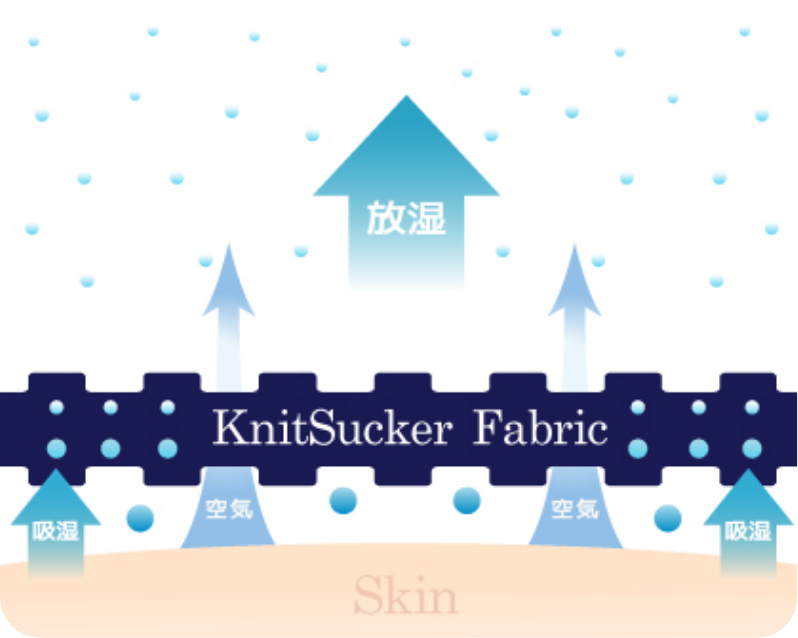 コットンが肌面の汗や水蒸気を吸収し、吸い取った水蒸気を逃がしてコントロール。サッカー生地の特徴である畝が空気の通り道になり、着用時の通気性のよさも実現し、こもった湿気による蒸れを防ぎ、さらりとした肌触りをキープします。
