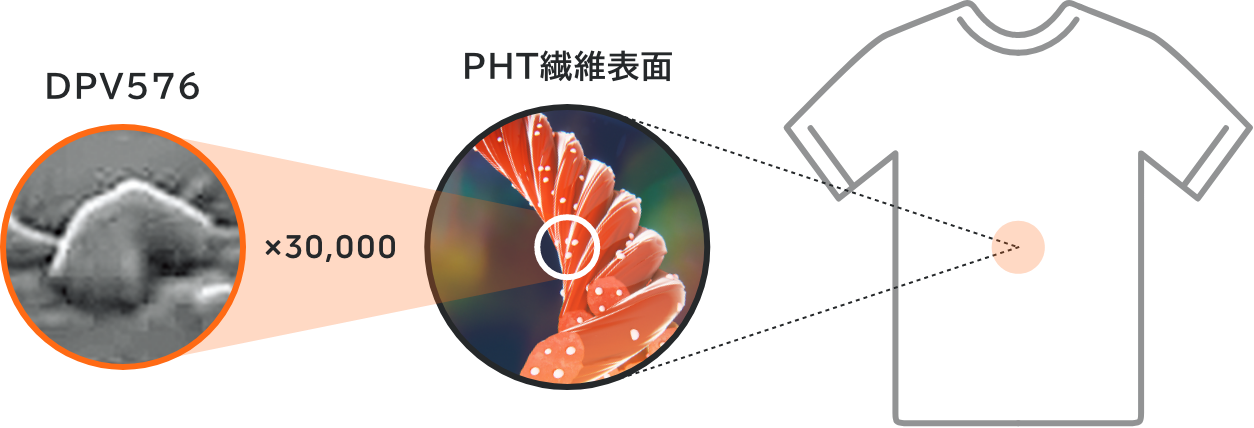 私たちは、ナノプラチナなどの鉱物などを含む独⾃素材「DPV576」を練り込んだPHT(Platinum Harmonized Technology)繊維を開発しました。PHT繊維の⼀本⼀本にこの素材が練り込まれていますので、洗濯などを⾏っても素材が機能減少することはなく(※)、繊維を作るにあたって⼈体に有害な薬品なども使っていません。